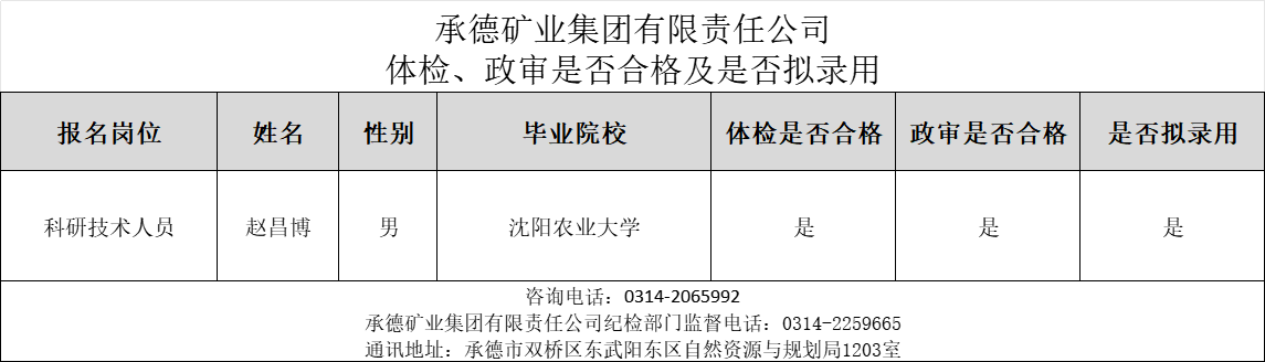 公示:承德礦業(yè)集團有限責任公司體檢、政審是否合格及是否擬錄用